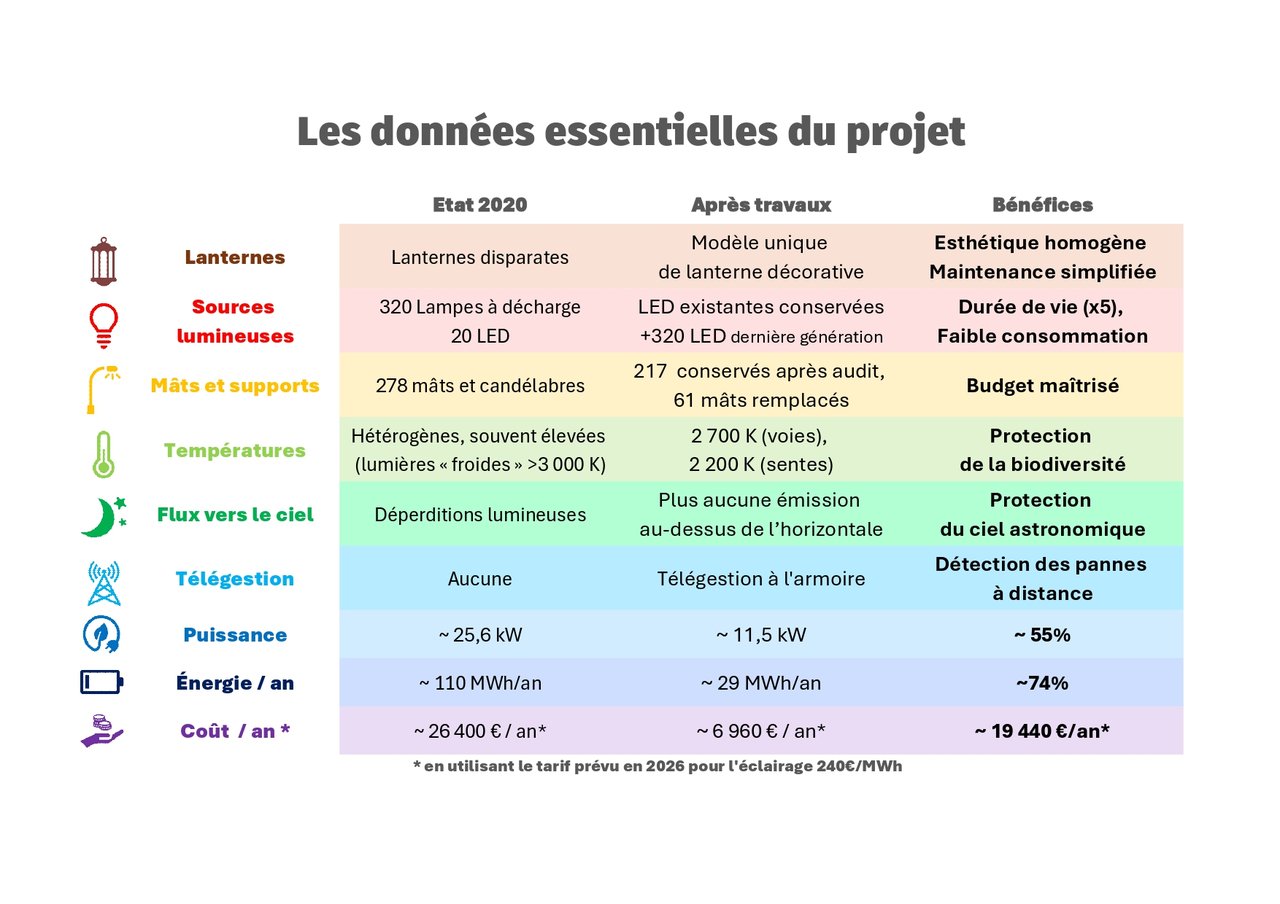 La rénovation repose sur le remplacement de 320 lanternes par des luminaires LED de dernière génération et sur la modernisation complète des 7 armoires de commande. Le Schéma Directeur d’Aménagement Lumineux (SDAL) a été révisé afin d’adapter précisément le niveau d’éclairement à chaque voie, en fonction de sa fréquentation réelle.