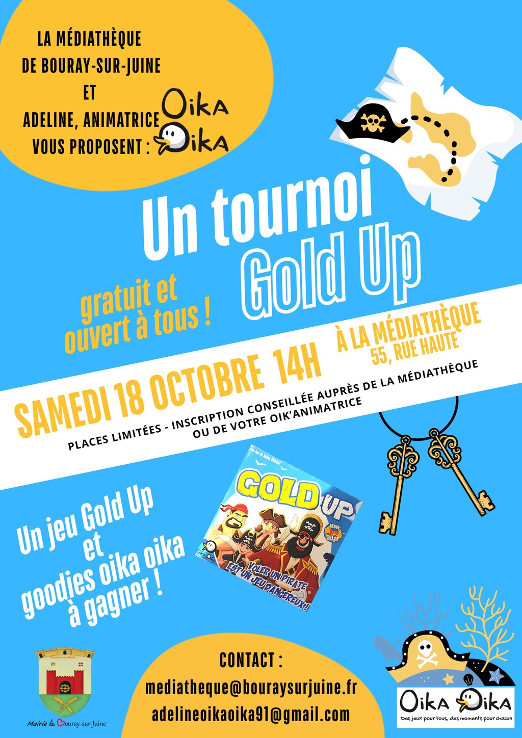 Votre Médiathèque, via son espace Ludothèque, a le plaisir de vous proposer samedi 18 octobre après-midi un temps fort ludique "Tournoi Gold Up"- gratuit et ouvert à tous - animé par Adeline Oïka Oïka.