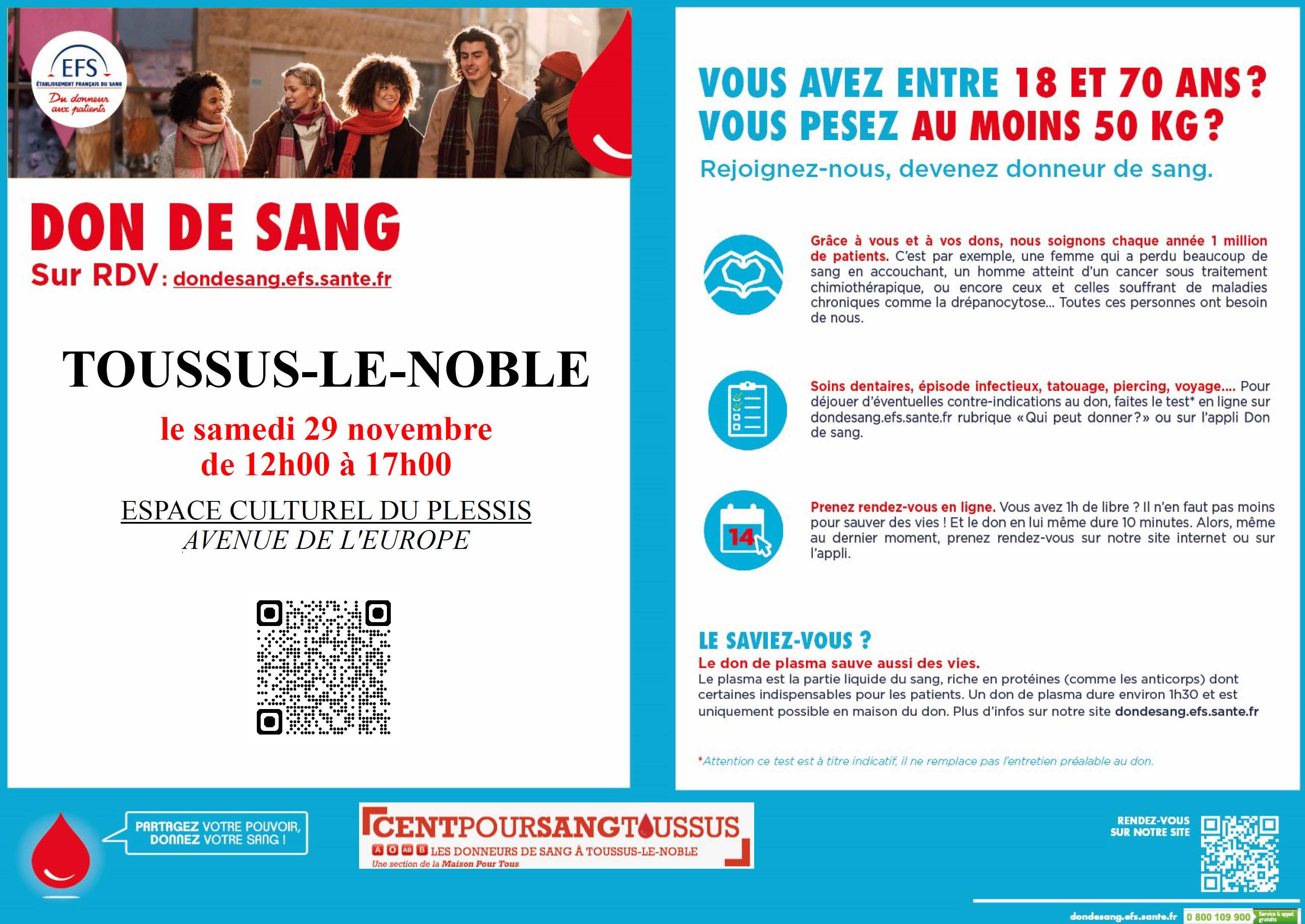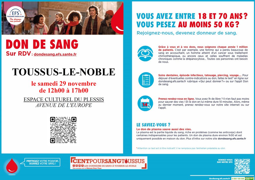Notre prochaine collecte de sang avec Cent Pour Sang Toussus de l'Etablissement Français du Sang est prévue samedi 29 novembre à l'Espace du Plessis à Ville de Toussus-Le-Noble .