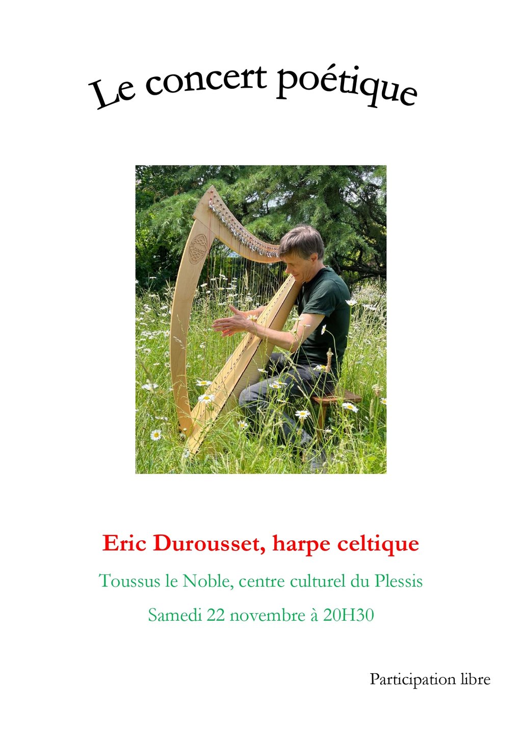 "Je vous propose une rencontre autour des mots et de la harpe. Les poètes que j’affectionne - Carlos Drummond de Andrade, Julos Beaucarne, Abdalattif Laâbi, Valérie Rouzeau et d’autres encore- sont issus d’univers culturels différents, mais ils se rejoignent dans un souci de l’autre, dans l’accueil de la différence. Ils expriment leur intimité, leurs fêlures mais aussi leur rêves et leurs révoltes. Je les dirai, guidé par les sonorités envoutantes et aquatiques de la harpe celtique."