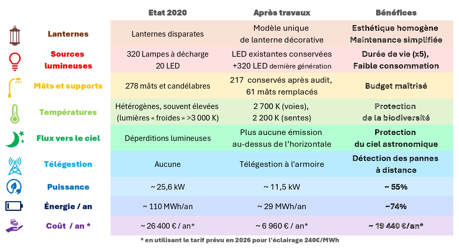 En considérant un tarif d'électricité constant (240 €/MWh en 2026), les économies d'énergie génèrent une économie d'environ 19 k€/an — sans compter la baisse des coûts de maintenance grâce à la télégestion et à la fiabilité des équipements LED. Le projet est dont rentabilisé en environ 8 ans, voire 6 si on prend en compte une augmentation de 10% des tarifs de l'énergie dans les prochaines années.